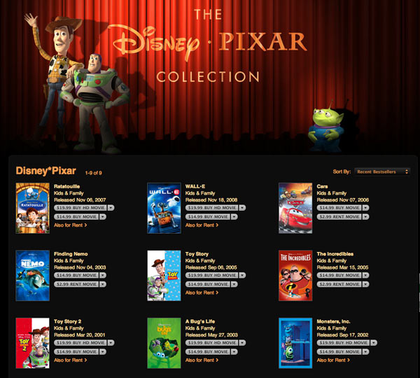 Apple iniziava a noleggiare film su iTunes Store USA nel gennaio 2008, poi si sono aggiunte poche altre nazioni, in Italia né in vendita né in affitto si trovano su iTunes Store film o serie TV. Con Apple TV capace di sfruttare solo i noleggi è stata una mossa quasi obbligatoria portare i film animati di Pixar su questo dispositivo venduto solo in Australia, Canada, Francia, Germania, Gran Bretagna, Irlanda e Stati Uniti.