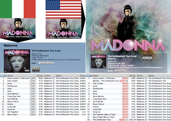 Mentre il prodotto "fisico" di Madonna consta di un CD (13 brani live) e di un DVD (oltre 2 ore di concerto con 21 brani), nelle versioni per queste nazioni europee Apple non può che rifilare solo l'audio (le 13 canzoni live più altre 2 tratte dal concerto, queste non vendute singolarmente). La versione "explicit" disponibile in Italia addirittura non include i 2 extra, inspiegabile.