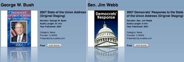 Questa settimana arriva su iTunes Store USA, gratuitamente, la digitalizzazione tratta dai programmi di C-SPAN del recente "State of the Union" di 51 minuti del presidente George W. Bush a Washington, per par condicio ecco pure la replica dei democratici tenuta da Jim Webb.
