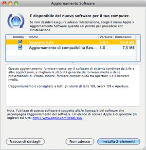 Da Aggiornamento Software è disponibile anche Supporto iLife 9.0.4, che fornisce risorse per il software di sistema condivise da iLife ed altre applicazioni, migliorando la stabilità generale del browser media e delle presentazioni di iPhoto. Inoltre, fornisce compatibilità tra Aperture 3 ed il browser media. Utile anche per chi possiede iWork ’09.