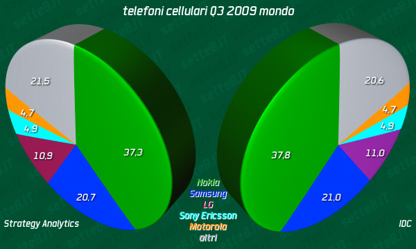 Solo i produttori coreani di telefoni cellulari possono gioire, tutti gli altri perdono terreno. Nokia è prima con il 37,3÷37,8% (-8% sul Q3 del 2008), Samsung è seconda con il 20,7÷21% (+16÷15,9% sul Q3 del 2008), LG è terza con il 10,9÷11% (+37÷37,4% sul Q3 del 2008), Sony Ericsson è quarta con il 4,9% (-45÷45,2% sul Q3 del 2008), Motorola è quinta con il 4,7% (-46÷46,4% sul Q3 del 2008). Altri produttori hanno una quota tra il 21,5 ed il 20,6%.
