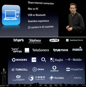 Apple ha mostrato al WWDC i 22 carrier con tethering operativi in 42 nazioni, quindi qualche telecom è per forza un multinazionale che opera in più paesi (come Vodafone, T-Mobile, Orange, TeliaSonera ed altri). Per esempio dei tre carrier russi solo uno offre il tethering e gli altri no, il che rafforza la tesi della illogicità delle scelte.
