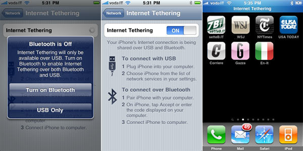 Ad un giorno dal rilascio della terza versione del sistema operativo dell'iPhone/iPod touch siamo in grado di mostrarvi come funziona il sistema del tethering ed anche che questo è abilitato sia da TIM che da Vodafone.