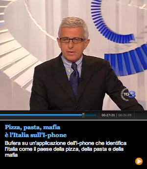 A 27 minuti e mezzo dall’inizio dell’ultima edizione del TG3 delle ore 19, il conduttore Giuliano Giubilei ha così introdotto il servizio sensazionalistico del giorno di Paolo Piras (con tanto di “documentazione” di Lucia Nocco): “per la Francia belle piazze, per l’Italia pizza e mafia, così la Apple identifica il nostro paese in un’applicazione da scaricare sull’iPhone ed è naturalmente un coro di proteste”.