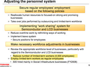 La principale azienda non automobilistica giapponese, Toshiba, ha annunciato una riduzione del personale di 4.500 impiegati entro l'anno fiscale 2008. Toshiba ricorrerà ai lavoratori temporanei facendone diventare alcuni a tempo indeterminato.