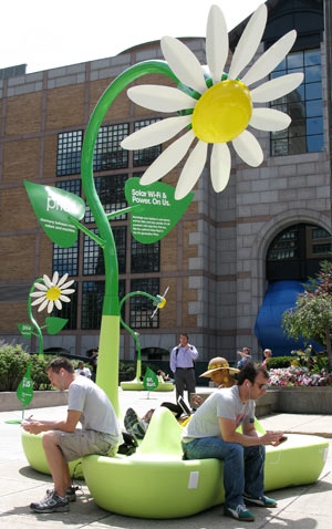 Negli Stati Uniti si troveranno questa estate giganti margherite nelle principali città con pannelli solari e collegamento Wi-Fi gratuito da offrire ai passanti. Iniziativa di marketing molto apprezzabile.