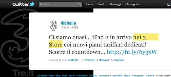 Aggiornamento del 19/09/2011: dopo 18 giorni 3 precisa fuori dal comunicato concordato con Apple dove lo venderà, nei 3Store.