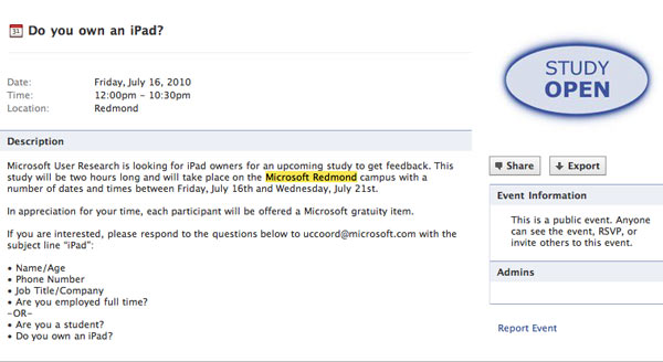 Oggi però TechCrunch ha scovato su Facebook un evento programmato per venerdì 16 e mercoledì 21 luglio, nel quale si legge: “Microsoft User Research cerca proprietari di iPad per una ricerca di mercato, venite per 2 ore al campus di Microsoft tra venerdì 16 e mercoledì 21 luglio, avremo dei doni per voi”.