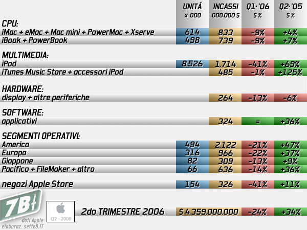 Nel periodo in esame, Apple ha venduto complessivamente 1,112 milioni di Mac e 8,526 milioni di iPod, dati che significano una crescita del 4% per il settore computer e del 61% per gli iPod sul Q2 del 2005.