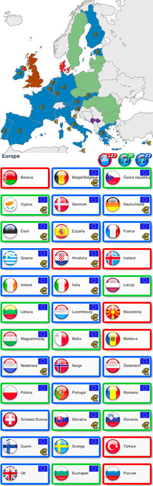 Fanno tutti parte della UE, ma qualcuno usa l’euro ed altri no (per esempio Lituania, Repubblica Ceca e Romania), eppure Apple in questo nuovo gruppo ha indicato solo i pagamenti in valuta comunitaria. Nella nostra grafica accanto potete vedere l’Europa di Apple, con le nazioni riquadrate in blu che erano quelle dove già esisteva un iTunes Store e con le nazioni riquadrate in verde che si aggiungono oggi, portando il totale da 23 a 35. Quelle riquadrate in rosso sono ancora orfane di un iTunes Store nazionale, ma fanno parte della più nutrita lista con l’App Store di riferimento.
