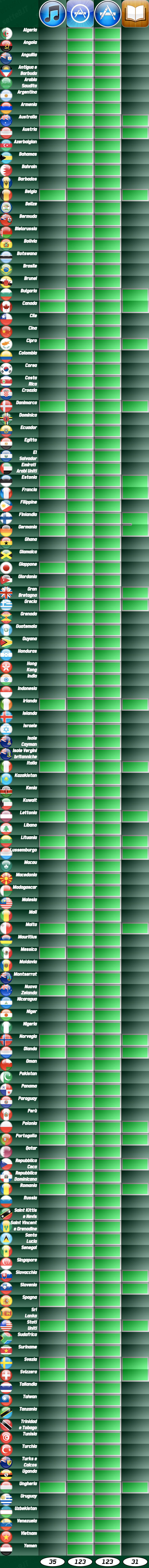 Qui sotto trovate l’aggiornamento ad oggi, gli iBookstore sono quindi 31, contro i 35 iTunes Store in attività.