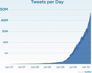 Nel 2007 solo 5.000 messaggi erano pubblicati online ogni giorno, 12 mesi fa Twitter ne gestiva 2,5 milioni, per poi raggiungere i 35 milioni a fine 2009, con un incremento del 1.400%. Proprio in quei giorni diventava molto popolare grazie alla prima fotografia del volo US Airways 1549, pubblicata da Janis Krum con il suo iPhone, appena perfettamente ammarato nel fiume Hudson.