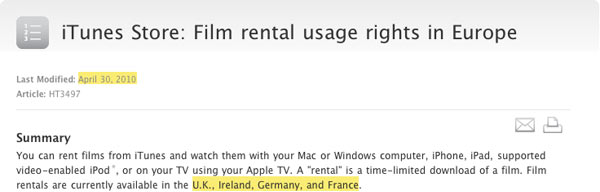 Il documento tecnico di Apple, datato 30 aprile, indicava la disponibilità dei film in affitto solo in Gran Bretagna, Irlanda, Germania e Francia, per quel che riguarda l’Europa.