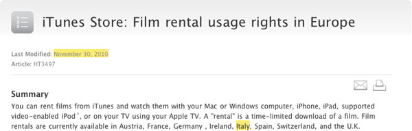 Per la prima volta leggiamo in un documento ufficiale di Apple che in Italia sono disponibili i film a noleggio da iTunes Store.