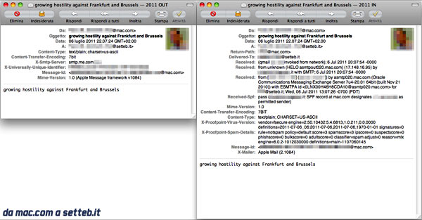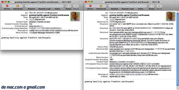 Ecco le nostre verifiche fatte nella giornata di mercoledì. Come potete vedere il messaggio contenente un’ipotesi di tensione politica, addirittura militare, tra Francoforte e Bruxelles è stato spedito da un indirizzo @mac.com ad un nostro @setteb.it, con esito positivo a distanza di pochi secondi