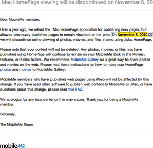 Il messaggio che vedete accanto è stato spedito oggi pomeriggio per avvisare che, le pagine create con HomePage di .Mac (e prima ancora, dal 2000, con iTools), saranno eliminate dai server di Cupertino il prossimo 8 novembre. O meglio, la “visualizzazione di questi file da queste pagine”.