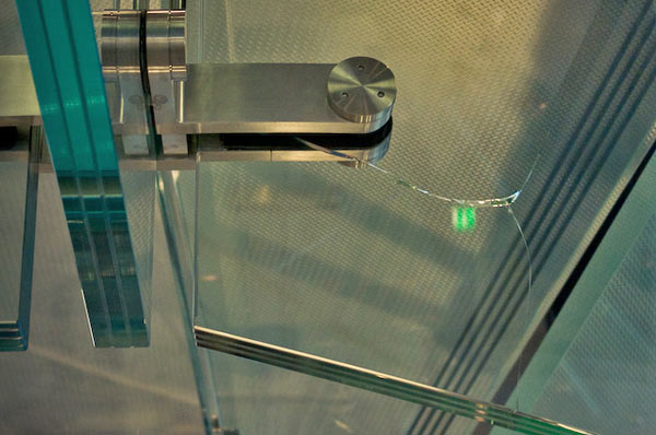 Grazie ad Anthony Nelzin di MacGeneration possiamo notare che non proprio tutto è perfetto. Ecco uno dei cristalli delle strutture interne che collegano i due piani, con un'importante crepa. Reggerà la folla dell'inaugurazione o dalla Germania stanno arrivando dei vetri sostitutivi da installare prima di sabato mattina?