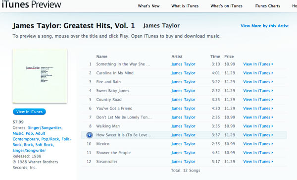Ecco per esempio su iTunes Store USA “Greatest hits, vol. 1” di James Taylor, con evidenziata, al posto del numero di traccia, l’icona da premere per ascoltare il mezzo minuto d’antprima. E’ disponibile per ogni canzone.