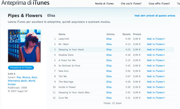 A titolo d’esempio vi mostriamo “Pipes & flowers” di Elisa, passando il mouse sul numero della traccia audio non succede nulla e non si tramuta nell’icona per ascoltare l’anteprima.