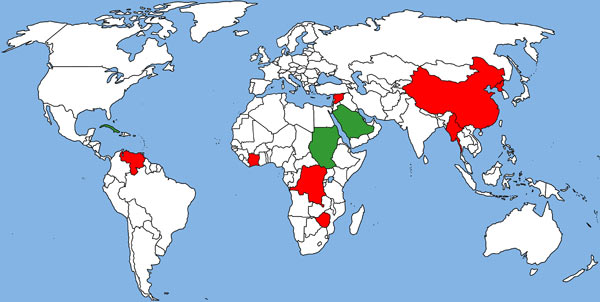 Altri paesi continuano ad essere sotto embrago per gli USA, a vario titolo: Birmania, Cina, Congo, Corea del Nord, Costa d’Avorio, Siria, Venezuela e Zimbabwe.