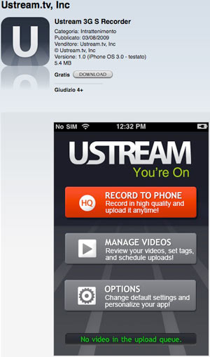 Chi si accontenta gode? E allora ecco "Ustream 3G S Recorder" che registra i video dalla camera dell'iPhone 3GS e li posta successivamente online su Facebook, Twitter, YouTube ed ovviamente Ustream.tv. Tutto gratuitamente.