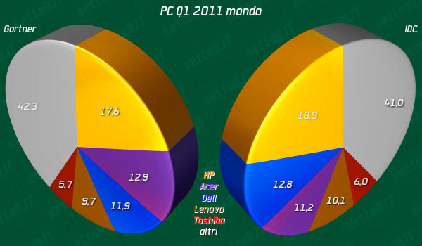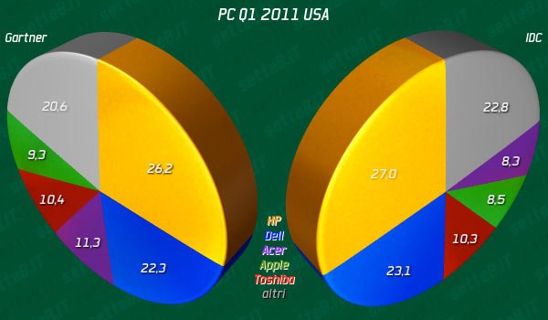 Ci sono le solite discordanze ma, almeno su un fatto le analisi hanno la stessa visione: le vendite di PC sono a sorpresa in calo. L’iPad 2 è visto ancora come il “colpevole”, ma le vendite dei Mac non subiscono rallentamenti, anzi, assieme a quelle di Lenovo e Toshiba. Grandi perdite per Acer adesso che sembra terminato il fuoco di paglia dei netbook, si capisce quindi il perché del licenziamento di Gianfranco Lanci da CEO dell’azienda taiwanese, visto che in USA (per IDC) il marchio verde (appena ridisegnato) cede il passo ad Apple con la quarta posizione in classifica.