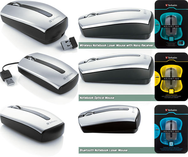 Verbatim ha annunciato tre nuovi mouse della famiglia Easy Riser: Wireless Notebook Laser Mouse with Nano Receiver (35 dollari), Notebook Optical Mouse con cavo retrattile (20 dollari) e Bluetooth Notebook Laser Mouse (40 dollari).