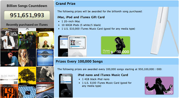Appena superati i 950 milioni di brani venduti è scattato il contatore e sulle pagine dei 21 iTMS nazionali attivi e sulla pagina apposita che spiega le "regole del gioco".