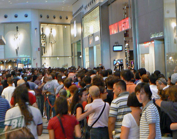 Il nostro corposo gruppo della redazione (in due) è arrivato alle 7 ed abbiamo visto crescere gradualmente la fila fuori dal centro commerciale, che si faceva bello per l’occasione. Prima delle 10 pubblicavamo le immagini di chi attendeva e le prime dall’interno del negozio, ancora chiuso al pubblico.