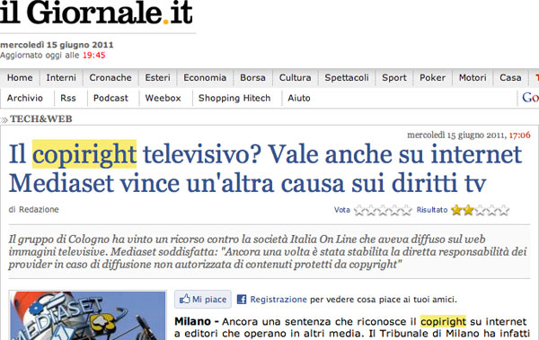 Aggiornamento del 15/06/2011: eppure sono di famiglia, ma ecco come al Giornale sono convinti che si debba scrivere “copiright”.