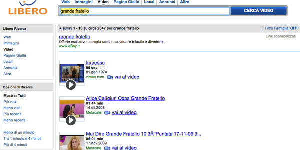 Come possiamo vedere nel portale Libero vengono proposti vari filmati tratti da “Grande Fratello” ed altri programmi Mediaset, anche se memorizzati su siti esterni come Metacafe, Vimeo, VodPod.