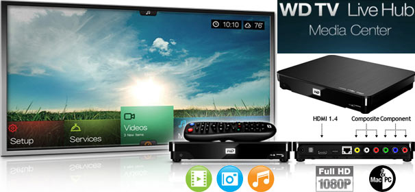 WD TV Live Hub è un set-top box con telecomando ed uscite sia digitali (HDMI/SPDIF) che analogiche (composita e component), si collega online per scaricare musica e video in streaming, ove disponibili. Appunto, non in Italia, in gran parte.