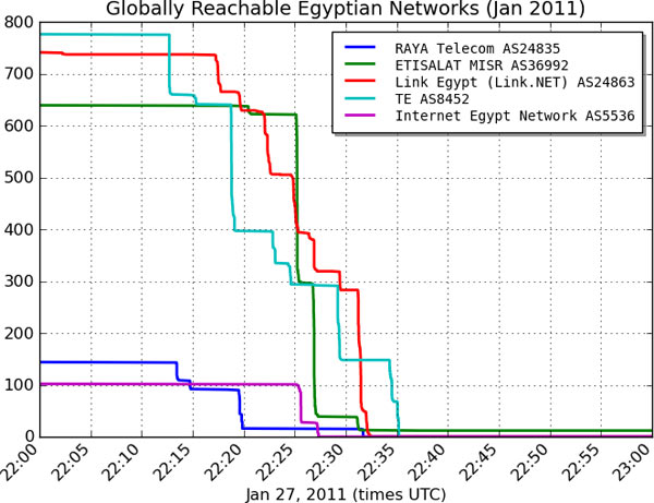 Pare però che solo un piccolo provider sia rimasto attivo per 80 milioni di egiziani, non Etisalat Misr, non Internet Egypt, non Link Egypt, non Telecom Egypt e non Vodafone/Raya (nessun traffico sulla backbone dell’italiana Seabone). Secondo Sophos solo l’8% dei cittadini ha potuto usare Internet in questo periodo.