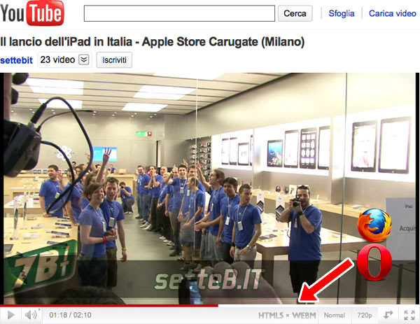Aprendo un filmato su YouTube con il tag HTML5 con Safari e Chrome questo identifica nella barra dei controlli semplicemente la scritta “HTML5″ ed il video si presenta al player del browser nel formato H.264, aprendolo con Opera 10 o Firefox 4 beta si legge nella barra dei controlli “HTML5 • WEBM”, ovvero utilizza la codifica open source.