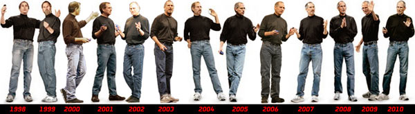 Anche per imitare Steve Jobs ce ne vuole, guardate la costanza delle scelte stilistiche durante il suo “secondo regno” a Cupertino. In rare occasioni si è discostato dalla maglia nera a girocollo a maniche lunghe arrotolate, dalle scarpe da ginnastica New Balance e dai jeans consumati, con apparizioni alternate della cintura per reggerli. La grafica di drimergallery è stata integrata con le annate mancanti.