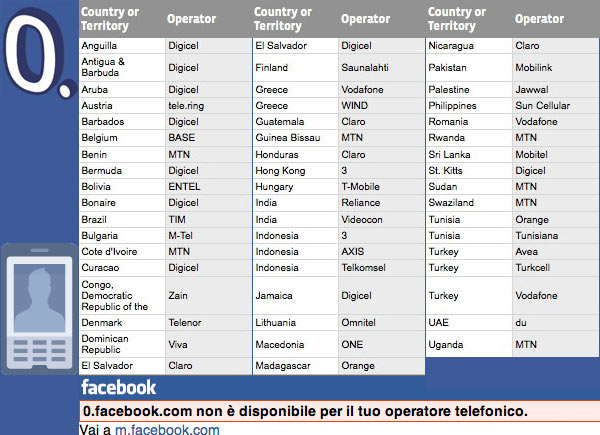 L’Italia non è elencata, anche se tutti e 4 i nostri carrier abbiano accettato di far parte del progetto di Facebook in altre nazioni (per esempio TIM in Brasile, Vodafone in Romania, Wind in Grecia e 3 in Indonesia).