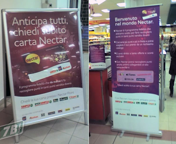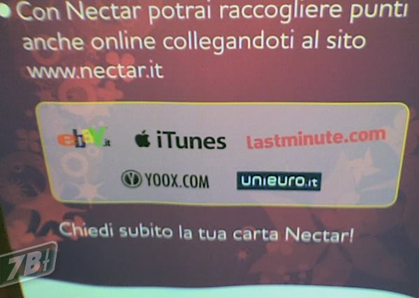 Anche in Italia c’è una carta di credito Nectar/MasterCard ma non si cita mai iTunes, come pure eBay, Last Minute e Yoox, anche loro raffigurati sul cartello.