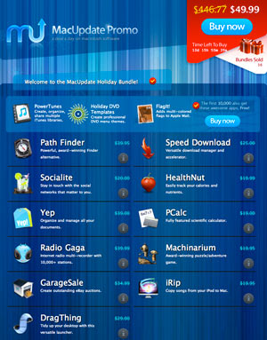Radio Gaga, Path Finder, Yep, GarageSale, DragThing, Socialite, Speed Download, HealthNut, Machinarium e PCalc sono l’offerta meno gustosa di quella dello scorso maggio, ma pur sempre interessante e di un valore complessivo di 447 dollari. Inoltre i primi 10.000 che acquisteranno il pacchetto scontato per soli 50 dollari (34 euro) potranno scaricare anche FlagIt!, Holiday DVD e PowerTunes gratis.