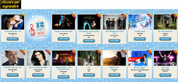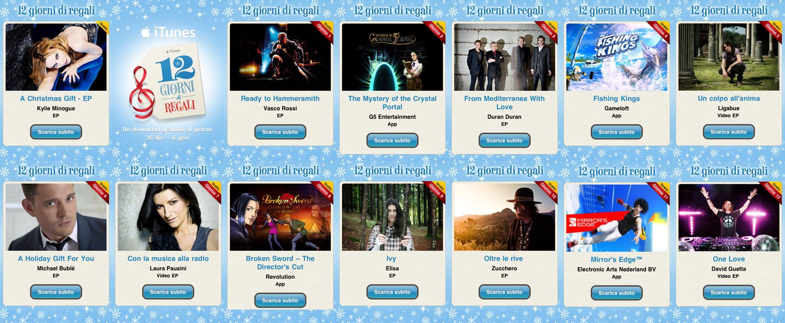 Con questo sono finiti i regali di musica, videoclip ed applicazioni agli utenti italiani di iTunes, ma altrove in Europa anche film e spettacoli televisivi. Appuntamento a (forse) fine anno.