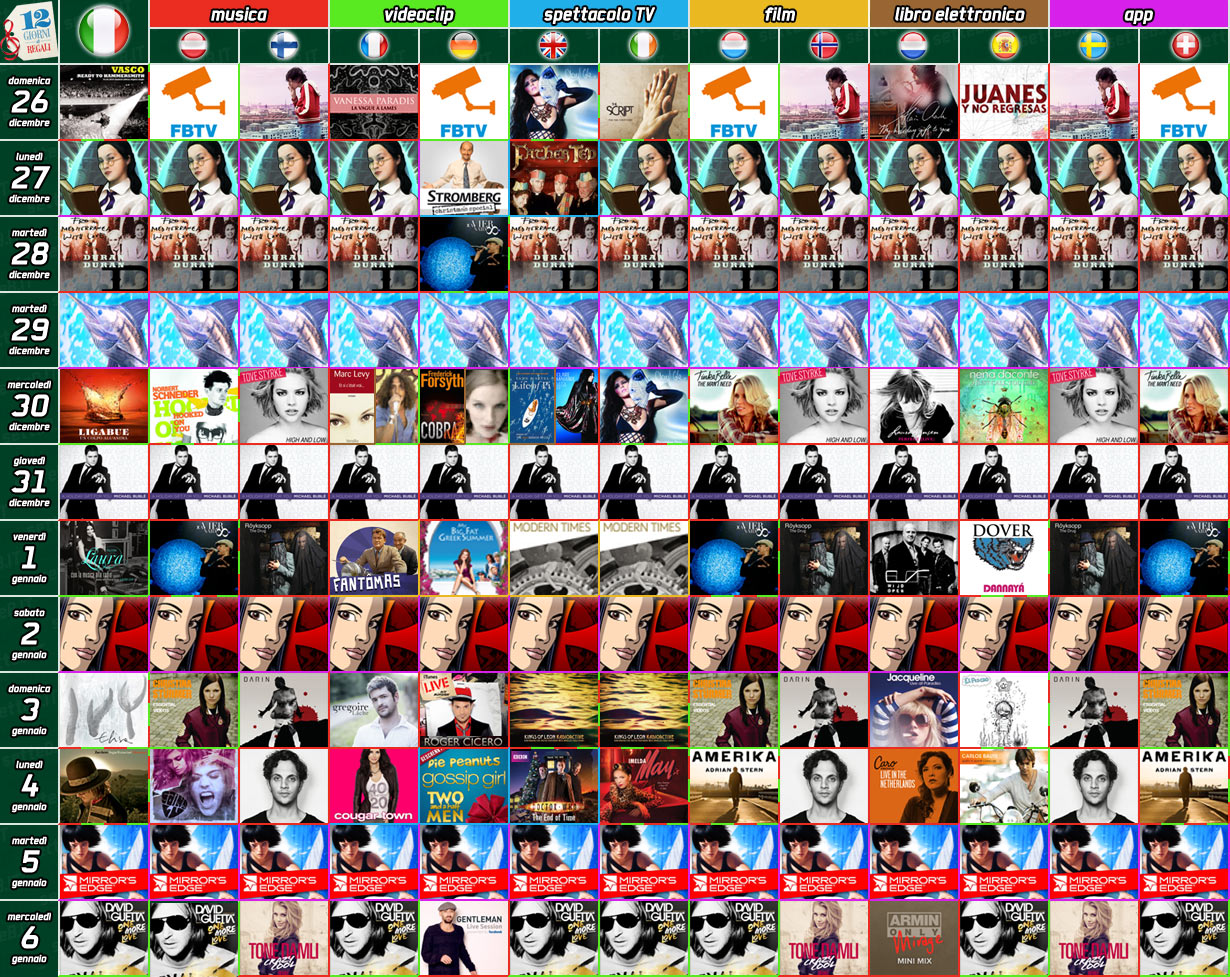 Prima di rimandarvi alla prossima edizione, se ci sarà, qui vi proponiamo tutti i regali dei 12 giorni in tutte le 13 nazioni europee dove è stata attivata la promozione. I colori della legenda identificano con le cornici che tipi di file è stato possibile scaricare gratuitamente.