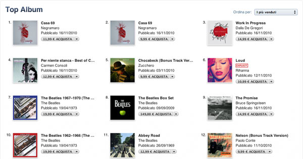 L’esclusiva ottenuta da Apple sarà anche stata costosa, ma starebbe già dando soddisfazioni. Certo è difficile fare meglio dei successi attuali di Negramaro, Dalla/De Gregori, Carmen Consoli, Zucchero e Rihanna, ma subito dopo questi campioni di vendita ci sono i Fab Four di Liverpool, che hanno smesso di suonare nel 1970.