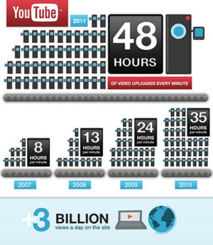 Ancora più impressionante è il livello dei filmati caricati sui server dagli utenti: era di 8 ore/minuto nel 2007, di 13 ore/minuto nel 2008, di 1 giorno/minuto nel 2009, di 35 ore/minuto nel 2010 ed infine, di 2 giorni/minuto quest’anno.