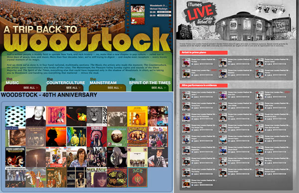 A 40 anni da quel giorno su iTunes Store Italia è comparsa la sezione Woodstock – 40th anniversary con raccolti 31 album degli artisti di allora: Jimi Hendrix, Joe Cocker, Jefferson Airplane, Santana, Credence Clearwater Revival, The who ed altri. Certo la sezione che si trova su iTunes Store USA è estremamente più ricca, intanto per la presenza delle raccolte complete e per i filmati girati tra gli hippie ed il fango.