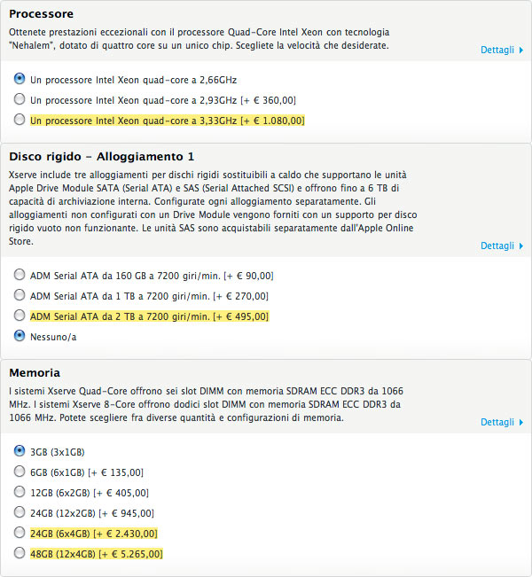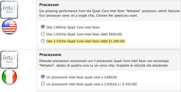 Aggiornamento del 05/12/2009: sono stati aggiornati anche gli Apple Store internazionali e le opzioni già viste in USA sono ora disponibili nel nostro paese. Per il Mac Pro con singolo processore la scelta dell’Intel Xeon @ 3,33 GHz costa ulteriori 1.080 euro rispetto al chip da 2,66 GHz, per gli Xserve un drive da 2 TB costa 495 euro e l’aggiunta di 12 moduli da 4 GB di RAM aumenta il prezzo di 5.265 euro. Il ricarico sembra molto (nonostante la differenza delle tasse locali) visto che 1 dollaro vale 0,67 euro.