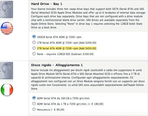 Per gli Xserve è disponibile un hard disk da 2 TB @ 7.200 rpm in ognuno dei tre slot, portando così il totale a 6 GB, il prezzo di ognuno di questi drive è di 550 dollari. Lo stesso drive si trova anche nella lista delle opzioni del Mac Pro, che ne può ospitare fino a quattro per un totale di 8 GB.