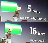 Steve Jobs assicura cifre rassicuranti (anche se non particolarmente sorprendenti) per quanto riguarda la durata della batteria dell'iPhone. 5 ore di telefonate oppure di navigazione web o di playback dei filmati. In attesa l'iPhone resta collegato alla rete per 16 ore. |