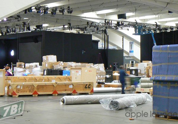 ...in fondo, il teatro di Apple, davanti un lungo striscione ricoperto anch'esso dagli scuri...