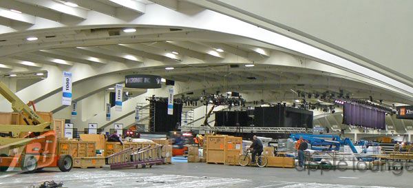 ...ecco come si presenta venerdì l'area espositiva principale, con al centro lo stand "nero" di Apple. Mancano quattro giorni all'inaugurazione ufficiale...