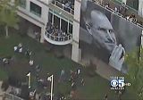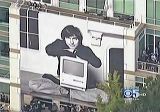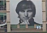 ...gigantografie di 3 piani appese all'interno del campus principale di Cupertino con lo Steve Jobs degli ultimi anni e quello più giovane degli inizi (© CBS)... |