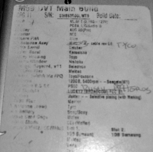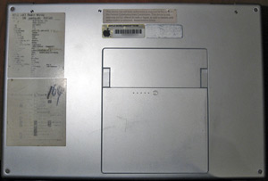 Dalle fotografie pubblicate dall’acquirente è stato inutilmente cancellato il numero seriale da System Profiler, perché questo si legge sull’etichetta con le note incollata sul fondo del laptop.